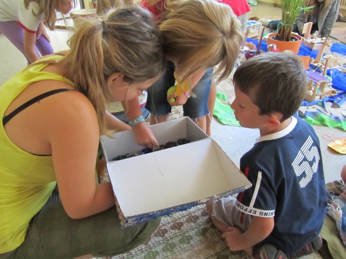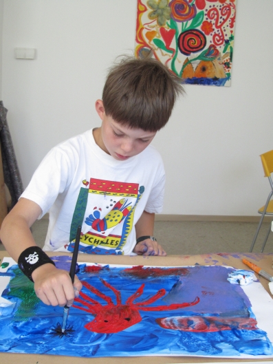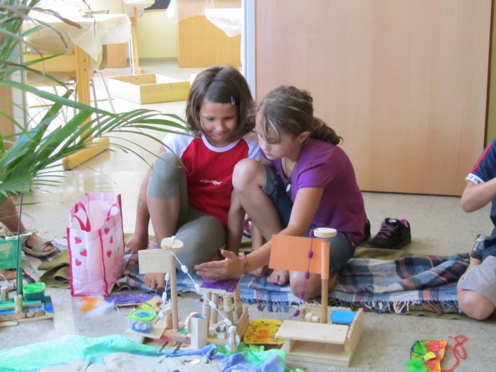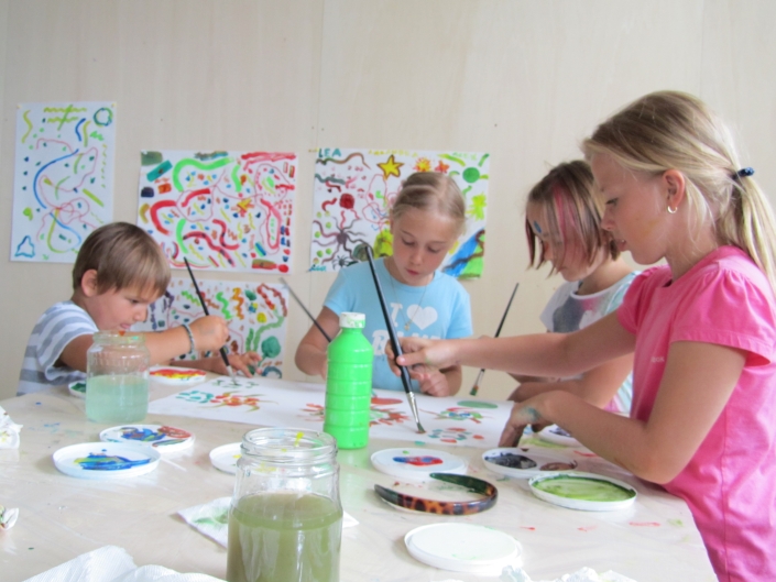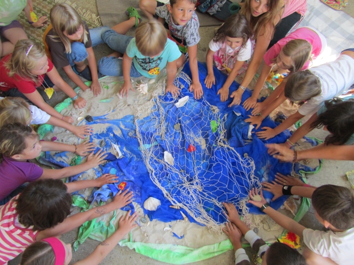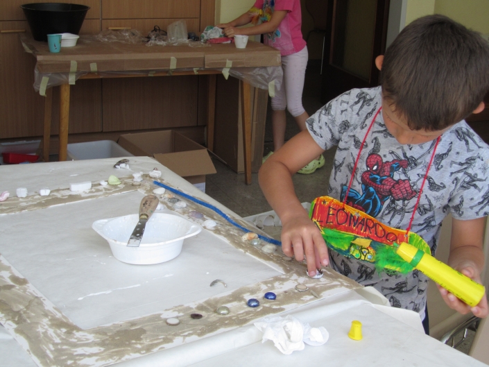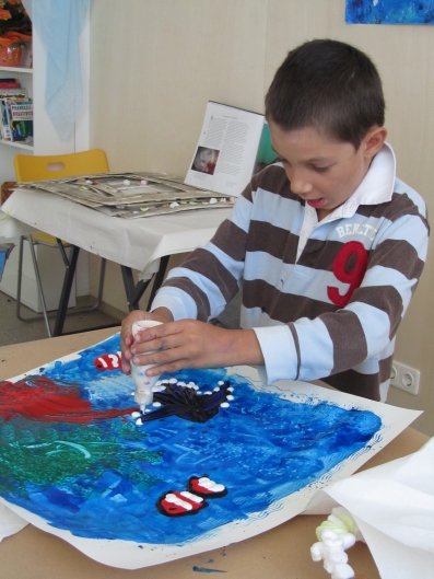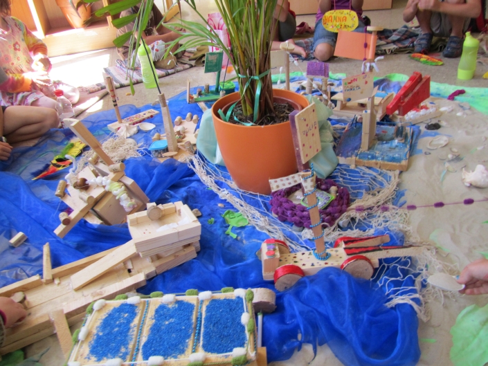 Wir bauten eine Flotte aus verschiedensten Phantasieschiffen, mit denen wir zu unserer Schatzinsel fuhren. Unser großes Entdeckerschiff besaß einen durchsichtigen Boden, durch den wir die Unterwasserwelt beobachten konnten, die wir dann in großen Bildern malten. Aus dem Meeressand und den Muscheln, die wir fanden, gestalteten wir Rahmen für unsere Meeresbilder.